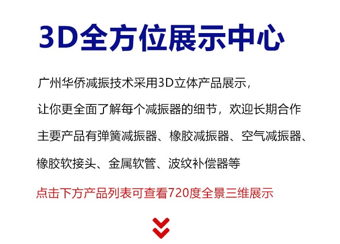 廣州華僑減振技術有限公司主要產品有彈簧減振器、橡膠減振器、空氣減振器、橡膠軟接頭、金屬軟管、波紋補償器等,其產品適用于水泵、風機、冷水機組、柴油機、冷卻塔、變壓器、風力發電等設備的基礎減振以及各類風機盤管,新風機組、風管等吊裝減振。波紋管產品及橡膠軟接頭通用于自來水、電力、鋼鐵、石油、化工、造紙、印刷等行業。